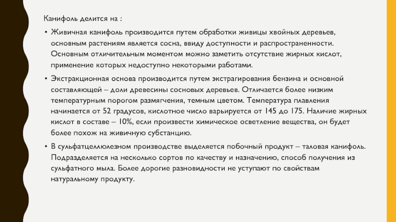 Канифоль делится на :Живичная канифоль производится путем обработки живицы хвойных деревьев, основным растениям является сосна, ввиду доступности