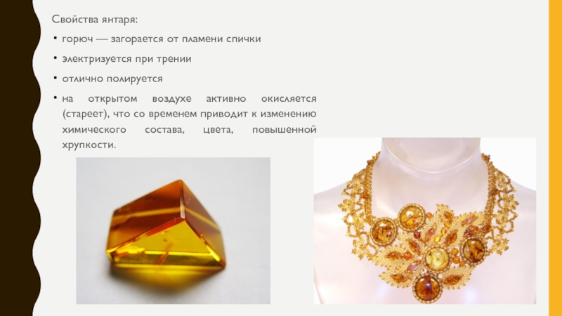 Свойства янтаря: горюч — загорается от пламени спички электризуется при тренииотлично полируется на открытом воздухе активно окисляется