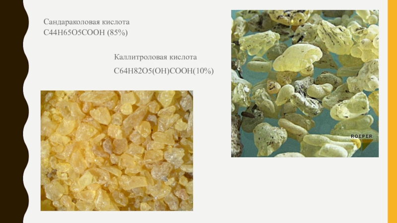 Сандараколовая кислота C44H65O5COОН (85%) Каллитроловая кислотаС64H82O5(ОН)СООН(10%)