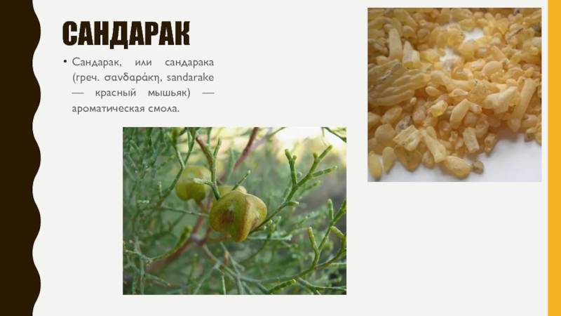 сандаракСандарак, или сандарака (греч. σανδαράκη, sandarake — красный мышьяк) — ароматическая смола.