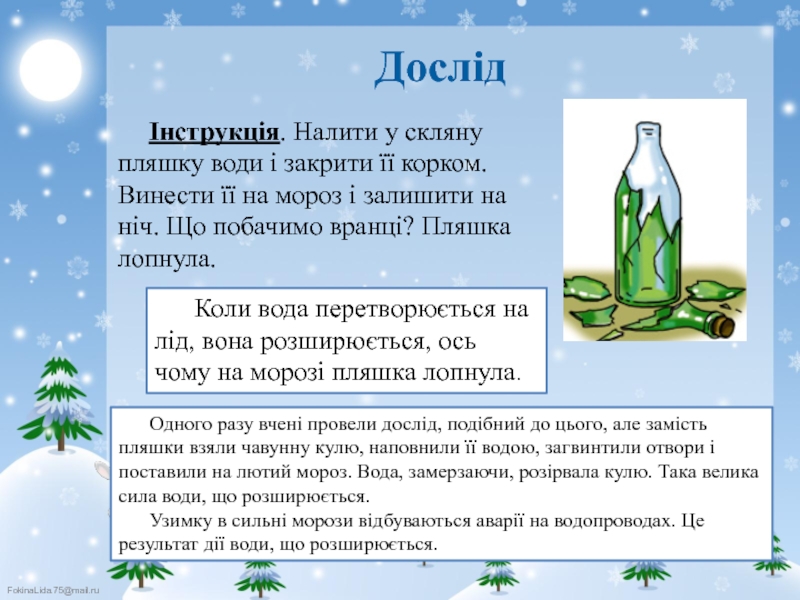 Одного разу вчені провели дослід, подібний до цього, але замість пляшки взяли чавунну кулю, наповнили її водою, загвинтили отвори і поставили на лютий мороз. Вода, замерзаючи, розірвала кулю. Така велика сила води, що розширюється.