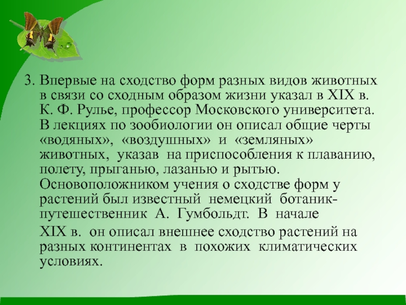 Рулье, профессор Московского университета. В лекциях по зообиологии он описал общие черты «водяных», «воздушных» и «земляных» животных, указав на приспособления к плаванию, полету, прыганью, лазанью и рытью. Основоположником учения о сходстве форм у растений был известный немецкий ботаник-путешественник А. Гумбольдт. В начале