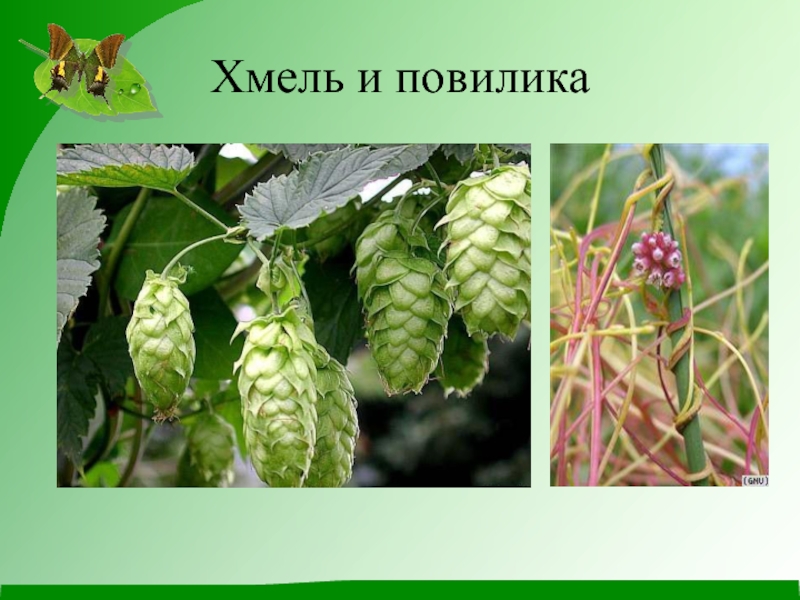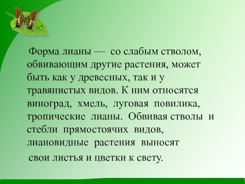 видов. К ним относятся виноград, хмель, луговая повилика, тропические лианы. Обвивая стволы и стебли прямостоячих видов, лиановидные растения выносят