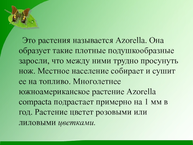 население собирает и сушит ее на топливо. Многолетнее южноамериканское растение Azorella compacta подрастает примерно на 1 мм в год. Растение цветет розовыми или лиловыми цветками.