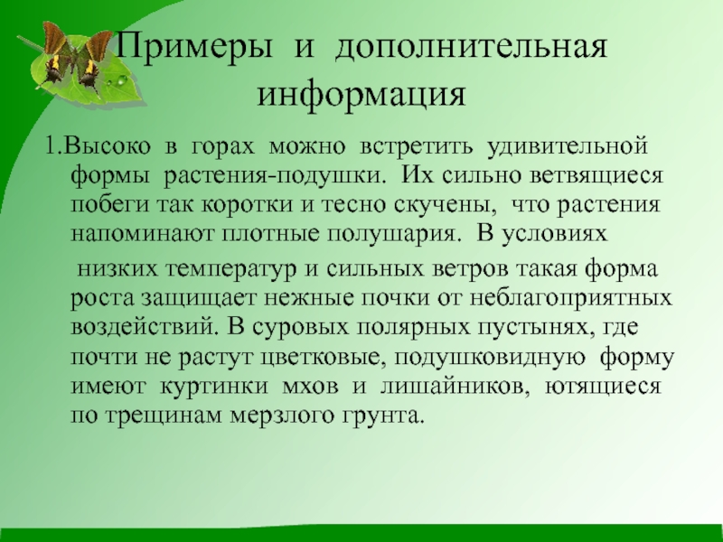 низких температур и сильных ветров такая форма роста защищает нежные почки от неблагоприятных воздействий. В суровых полярных пустынях, где почти не растут цветковые, подушковидную форму имеют куртинки мхов и лишайников, ютящиеся по трещинам мерзлого грунта.