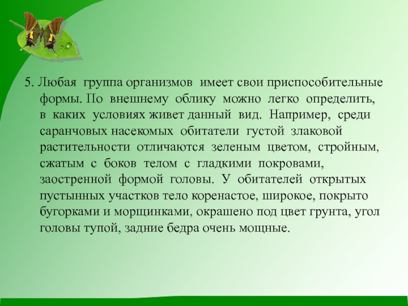 Слайд 425. Любая группа организмов имеет свои приспособительные формы. По внешнему