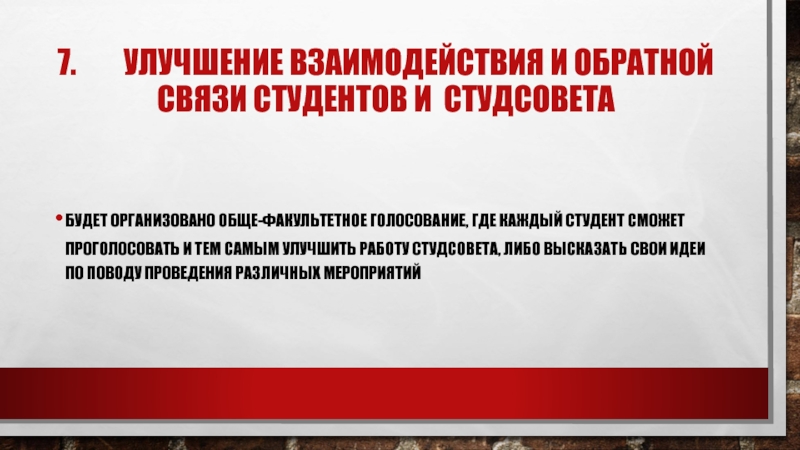 7.    Улучшение взаимодействия и обратной     связи студентов и студсоветаБудет организовано