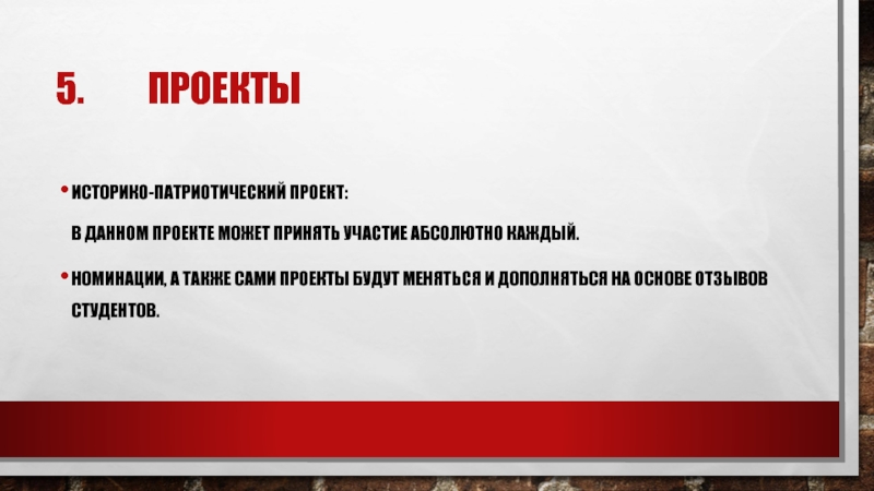 5.     ПроектыИсторико-патриотический проект:   В данном проекте может принять участие абсолютно каждый.