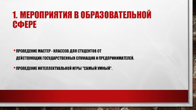 1. Мероприятия в образовательной сфереПроведение мастер - классов для студентов от действующих государственных служащих и предпринимателей.Проведение интеллектуальной игры "Самый умный".