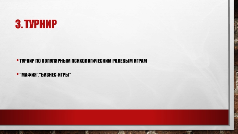 3.	ТурнирТурнир по популярным психологическим ролевым играм
