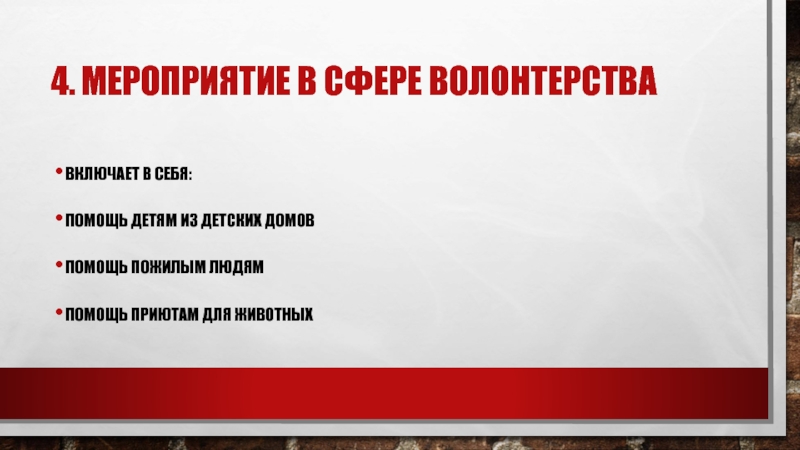 4.	Мероприятие в сфере волонтерства Включает в себя:Помощь детям из детских домовПомощь пожилым людямПомощь приютам для животных