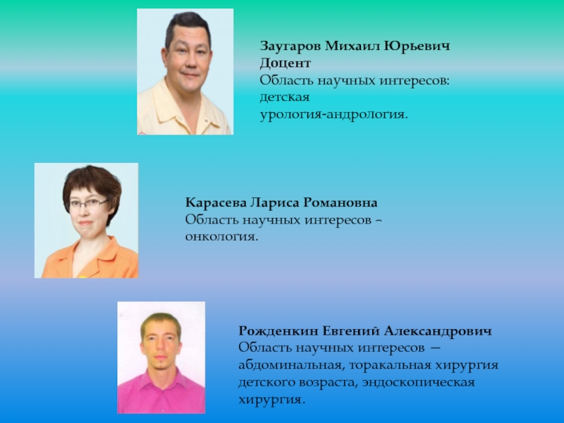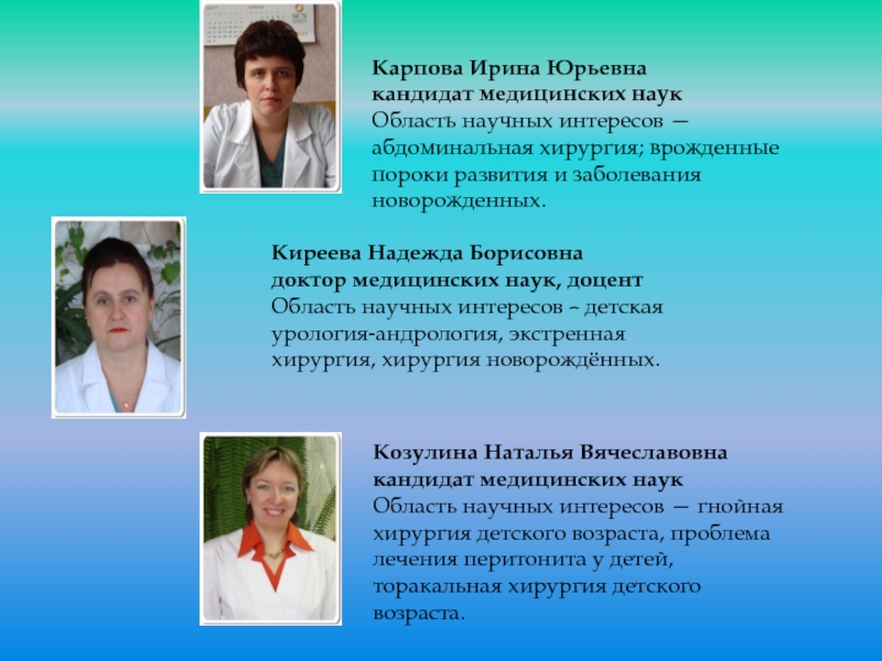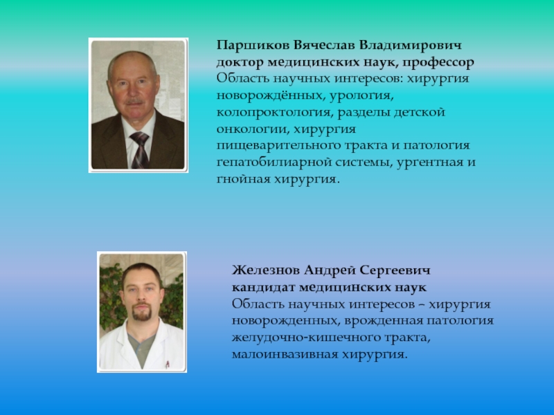 Область научных интересов — абдоминальная хирургия; врожденные пороки развития и заболевания новорожденных.