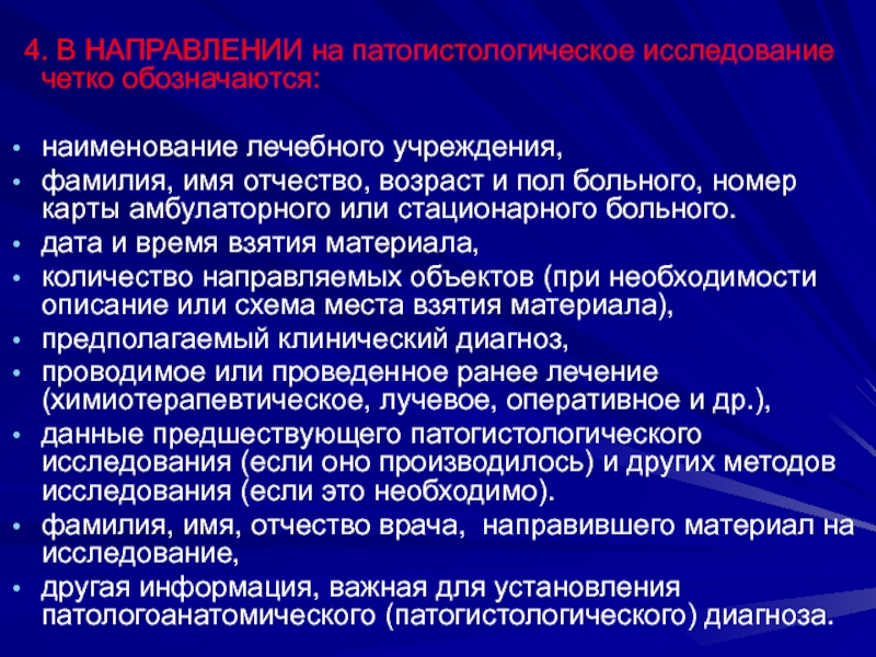 4. В НАПРАВЛЕНИИ на патогистологическое исследование четко обозначаются: