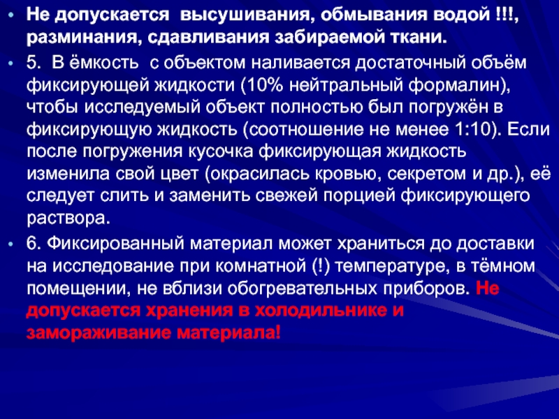 Слайд 15Не допускается высушивания, обмывания водой !!!, разминания, сдавливания забираемой ткани.