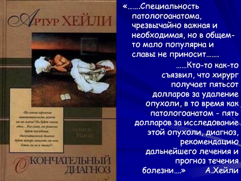 ……Кто-то как-то съязвил, что хирург получает пятьсот долларов за удаление опухоли, в то время как патологоанатом - пять долларов за исследование этой опухоли, диагноз, рекомендацию дальнейшего лечения и прогноз течения болезни….» А.Хейли