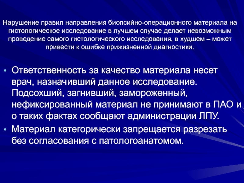 Ответственность за качество материала несет врач, назначивший данное исследование. Подсохший, загнивший, замороженный, нефиксированный материал не принимают в ПАО и о таких фактах сообщают администрации ЛПУ.