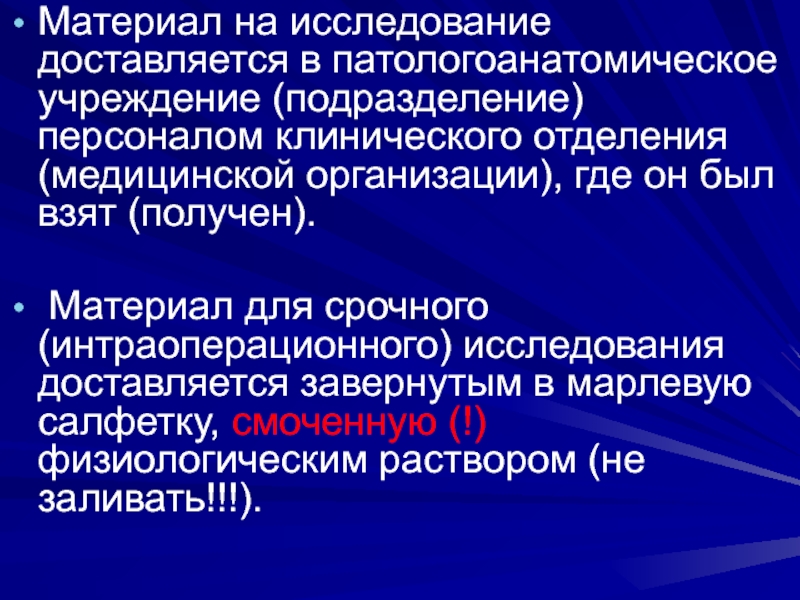 Слайд 16Материал на исследование доставляется в патологоанатомическое учреждение (подразделение) персоналом клинического