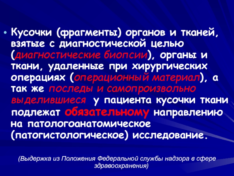 Слайд 8Кусочки (фрагменты) органов и тканей, взятые с диагностической целью (диагностические