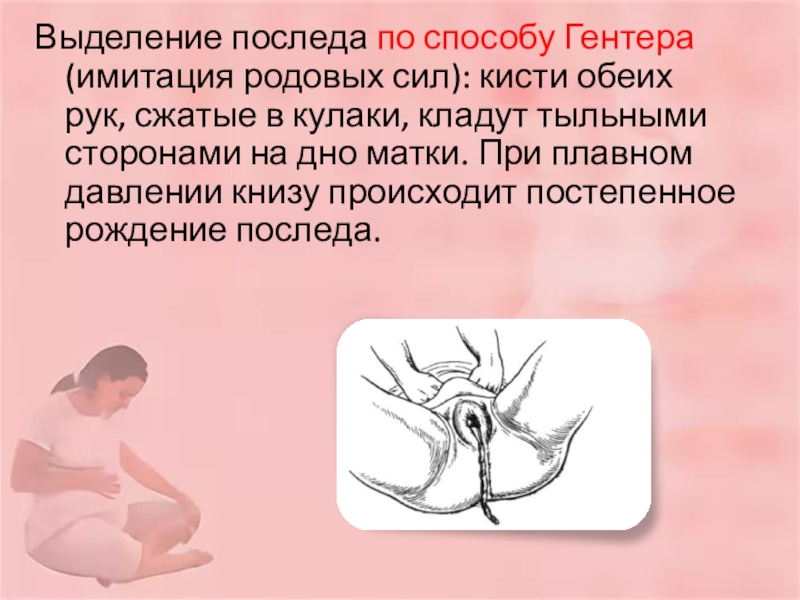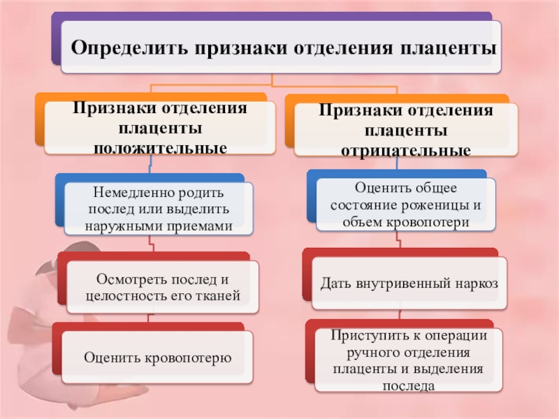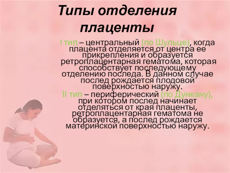 способствует последующему отделению последа. В данном случае послед рождается плодовой поверхностью наружу.ІІ тип – периферический (по Дункану),при котором послед начинает отделяться от края плаценты, ретроплацентарная гематома не образуется, а послед рождается материнской поверхностью наружу.