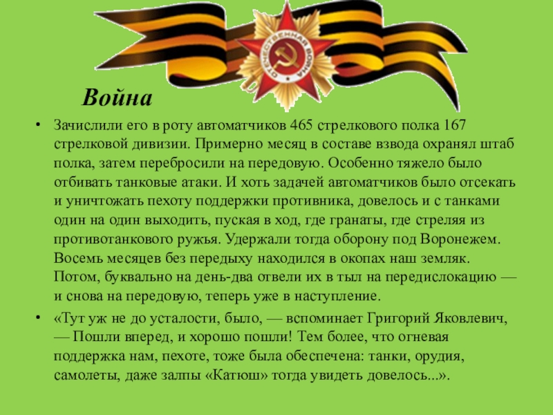 Зачислили его в роту автоматчиков 465 стрелкового полка 167 стрелковой