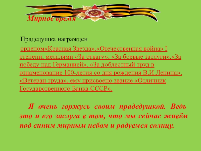 Я очень горжусь своим прадедушкой. Ведь это и его заслуга в том, что мы сейчас живём под синим мирным небом и радуемся солнцу.