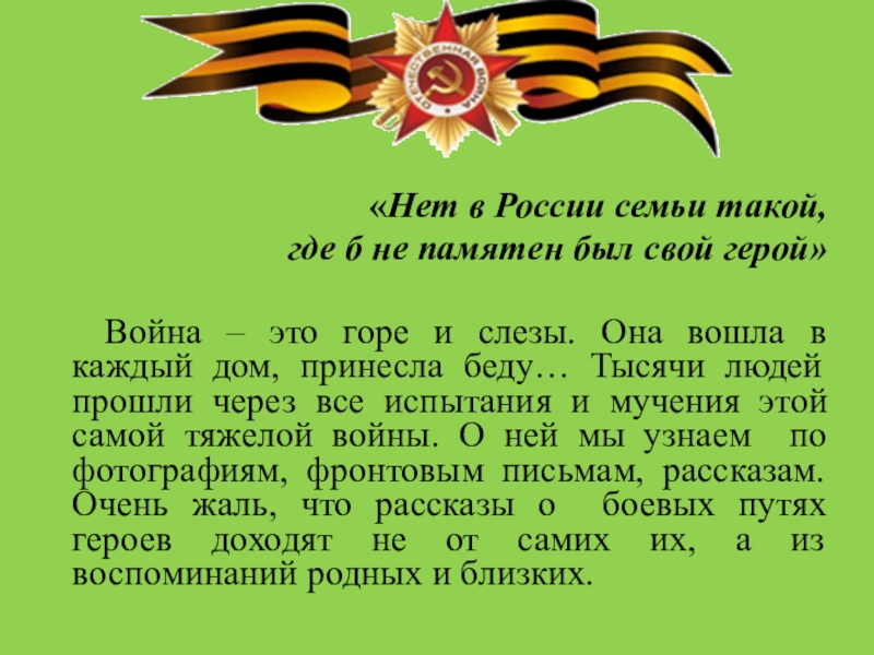 каждый дом, принесла беду… Тысячи людей прошли через все испытания и мучения этой самой тяжелой войны. О ней мы узнаем по фотографиям, фронтовым письмам, рассказам. Очень жаль, что рассказы о боевых путях героев доходят не от самих их, а из воспоминаний родных и близких.