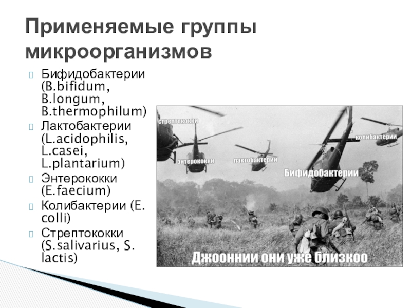 Бифидобактерии (B.bifidum, B.longum, B.thermophilum)Лактобактерии (L.acidophilis, L.casei, L.plantarium)Энтерококки (E.faecium)Колибактерии (E. colli)Стрептококки (S.salivarius, S. lactis)Применяемые группы микроорганизмов