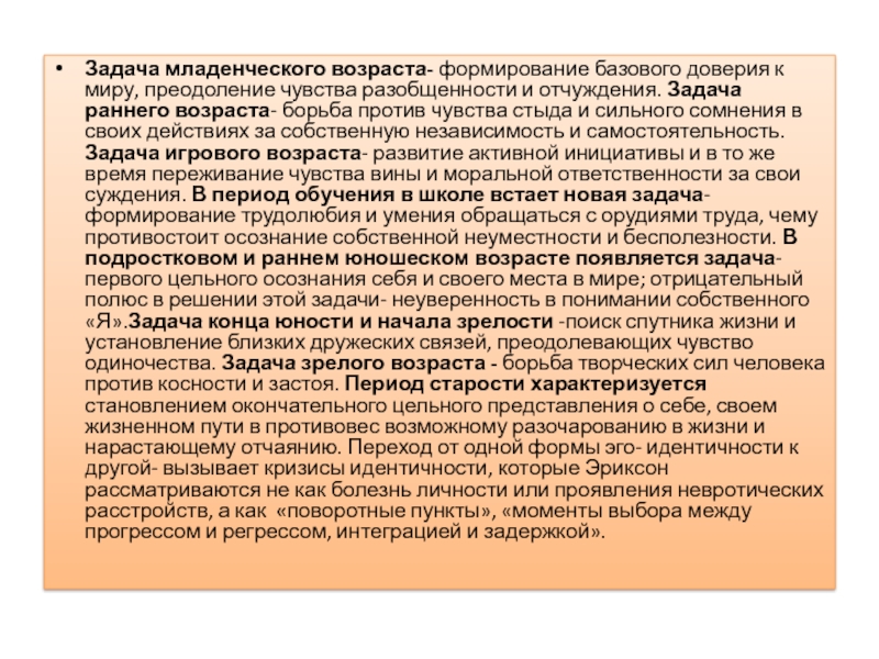 Задача младенческого возраста- формирование базового доверия к миру, преодоление чувства разобщенности и отчуждения. Задача раннего возраста- борьба