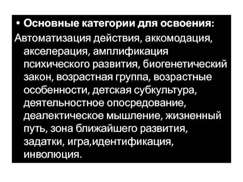 Основные категории для освоения:Автоматизация действия, аккомодация, акселерация, амплификация психического развития, биогенетический закон, возрастная группа, возрастные особенности, детская