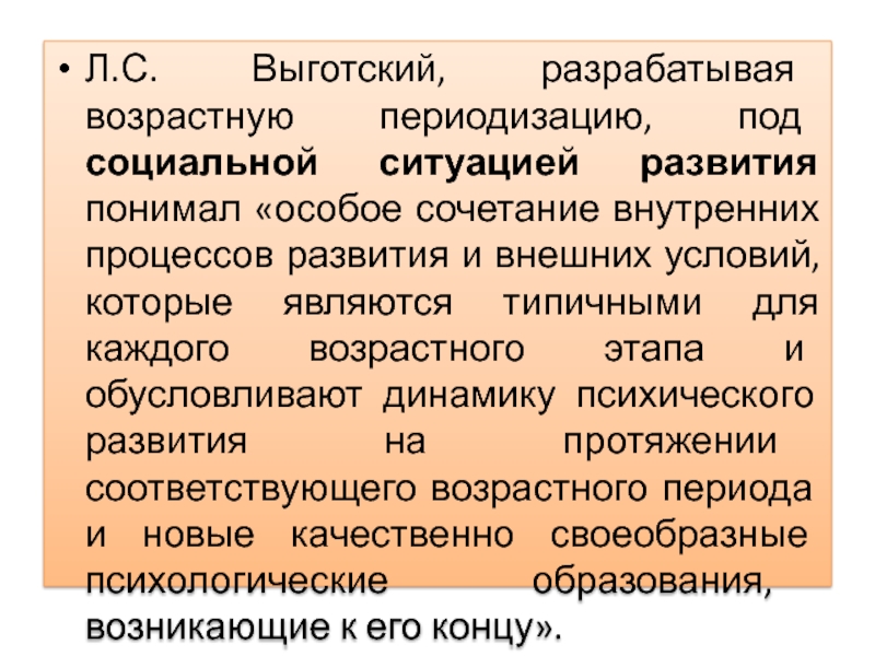 Л.С. Выготский, разрабатывая возрастную периодизацию, под социальной ситуацией развития понимал «особое сочетание внутренних процессов развития и внешних