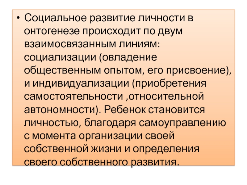 Слайд 24Социальное развитие личности в онтогенезе происходит по двум взаимосвязанным линиям: