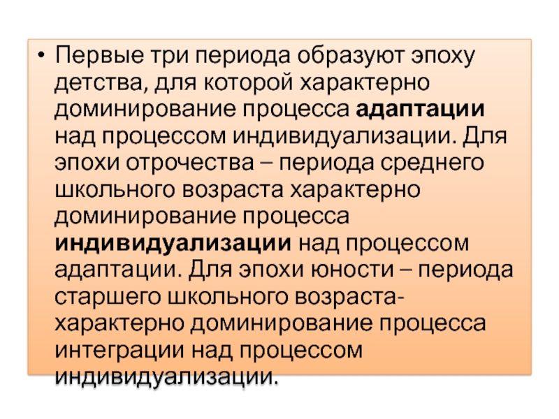 Первые три периода образуют эпоху детства, для которой характерно доминирование процесса адаптации над процессом индивидуализации. Для эпохи