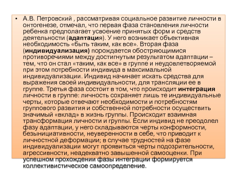 Слайд 22А.В. Петровский , рассматривая социальное развитие личности в онтогенезе, отмечал,