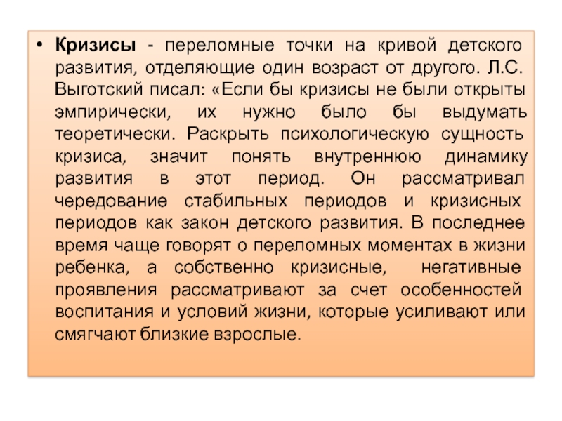 были открыты эмпирически, их нужно было бы выдумать теоретически. Раскрыть психологическую сущность кризиса, значит понять внутреннюю динамику развития в этот период. Он рассматривал чередование стабильных периодов и кризисных периодов как закон детского развития. В последнее время чаще говорят о переломных моментах в жизни ребенка, а собственно кризисные, негативные проявления рассматривают за счет особенностей воспитания и условий жизни, которые усиливают или смягчают близкие взрослые.