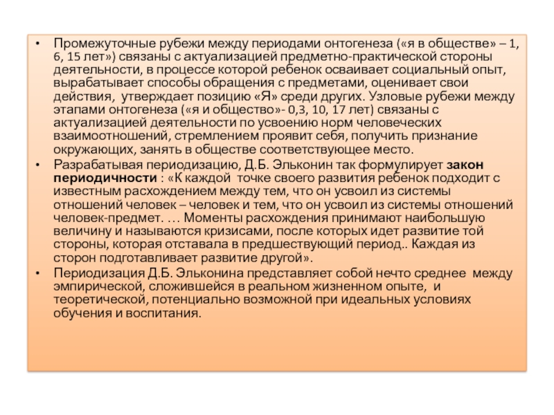Разрабатывая периодизацию, Д.Б. Эльконин так формулирует закон периодичности : «К каждой точке своего развития ребенок подходит с известным расхождением между тем, что он усвоил из системы отношений человек – человек и тем, что он усвоил из системы отношений человек-предмет. … Моменты расхождения принимают наибольшую величину и называются кризисами, после которых идет развитие той стороны, которая отставала в предшествующий период.. Каждая из сторон подготавливает развитие другой».