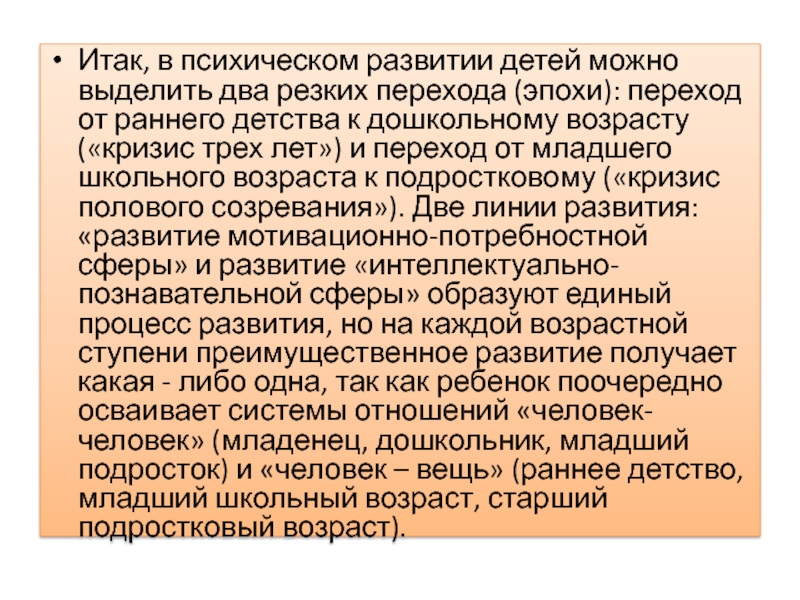 Итак, в психическом развитии детей можно выделить два резких перехода (эпохи): переход от раннего детства к дошкольному