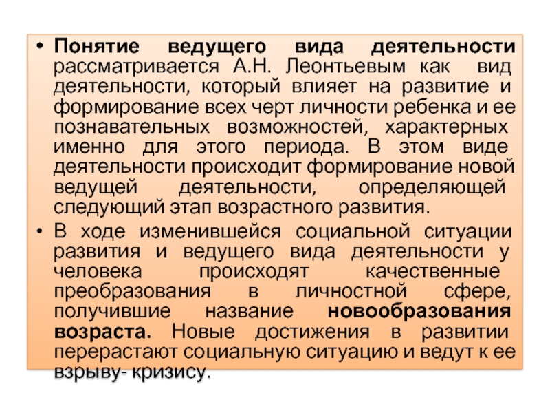 Слайд 11Понятие ведущего вида деятельности рассматривается А.Н. Леонтьевым как вид деятельности,