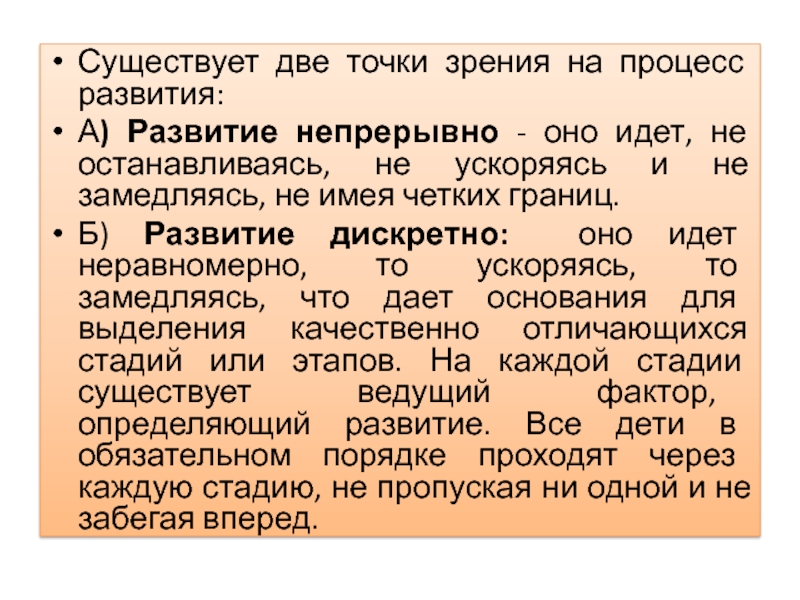 Существует две точки зрения на процесс развития:А) Развитие непрерывно - оно идет, не останавливаясь, не ускоряясь и