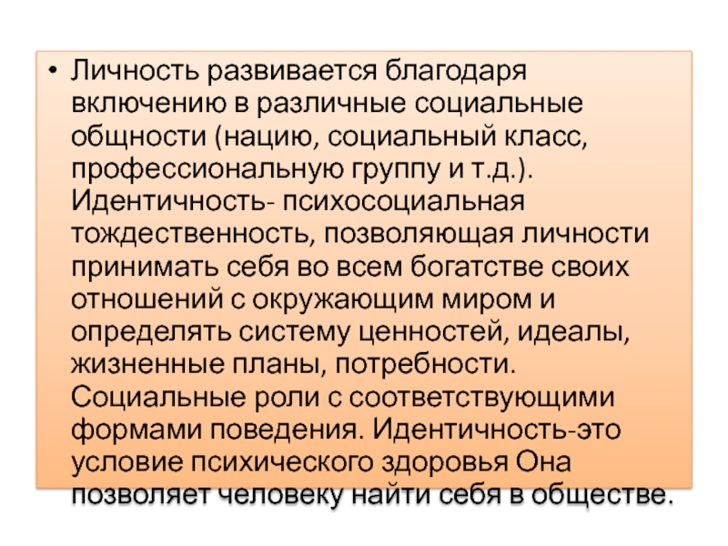 Личность развивается благодаря включению в различные социальные общности (нацию, социальный класс, профессиональную группу и т.д.). Идентичность- психосоциальная