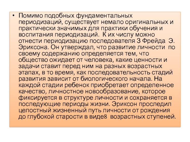 отнести периодизацию последователя З Фрейда Э. Эриксона. Он утверждал, что развитие личности по своему содержанию определяется тем, что общество ожидает от человека, какие ценности и задачи ставит перед ним на разных возрастных этапах, в то время, как последовательность стадий развития зависит от биологического начала. На каждой стадии ребенок приобретает определенное качество, личностное новообразование, которое фиксируется в структуре личности и сохраняется в последующие периоды жизни. Эриксон проследил целостный жизненный путь личности от рождения до глубокой старости в виде8 возрастных ступеней.