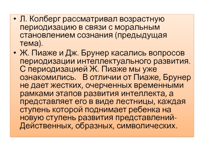 Л. Колберг рассматривал возрастную периодизацию в связи с моральным становлением сознания (предыдущая тема). Ж. Пиаже и Дж.