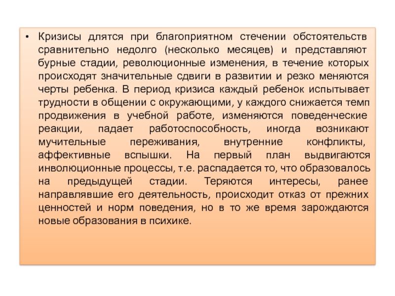 Слайд 13Кризисы длятся при благоприятном стечении обстоятельств сравнительно недолго (несколько месяцев)