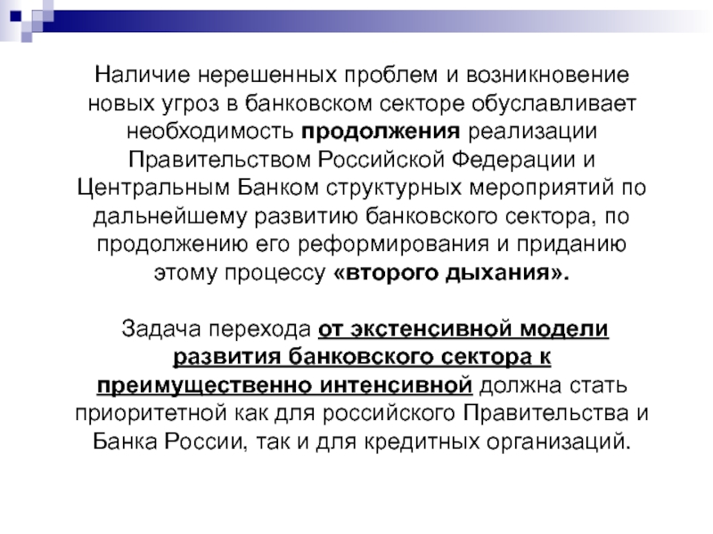 Наличие нерешенных проблем и возникновение новых угроз в банковском секторе обуславливает необходимость продолжения реализации Правительством Российской Федерации