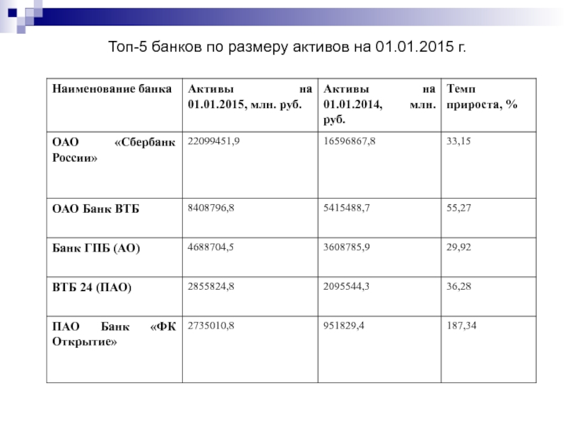 Слайд 3Топ-5 банков по размеру активов на 01.01.2015 г.