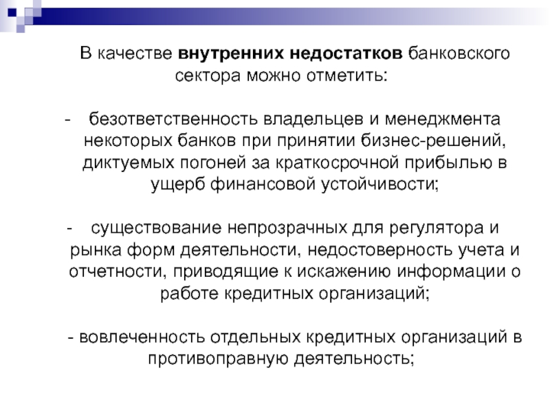 В качестве внутренних недостатков банковского сектора можно отметить:безответственность владельцев и менеджмента некоторых банков при принятии бизнес-решений, диктуемых