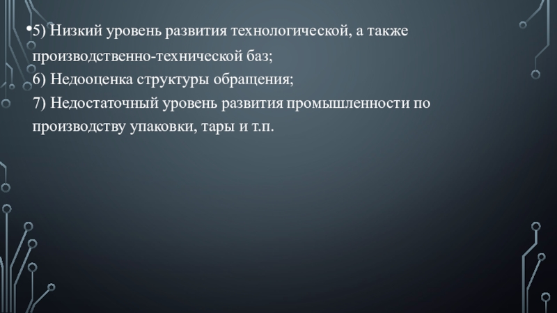 Слайд 55) Низкий уровень развития технологической, а также производственно-технической баз; 6) Недооценка