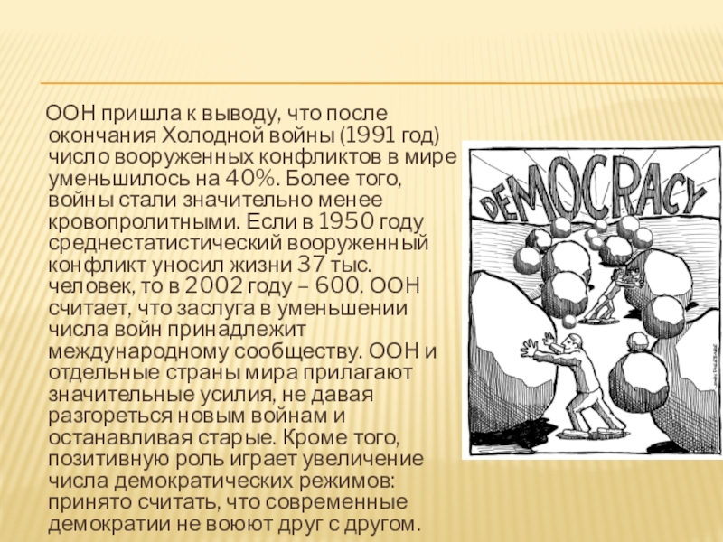 на 40%. Более того, войны стали значительно менее кровопролитными. Если в 1950 году среднестатистический вооруженный конфликт уносил жизни 37 тыс. человек, то в 2002 году – 600. ООН считает, что заслуга в уменьшении числа войн принадлежит международному сообществу. ООН и отдельные страны мира прилагают значительные усилия, не давая разгореться новым войнам и останавливая старые. Кроме того, позитивную роль играет увеличение числа демократических режимов: принято считать, что современные демократии не воюют друг с другом.