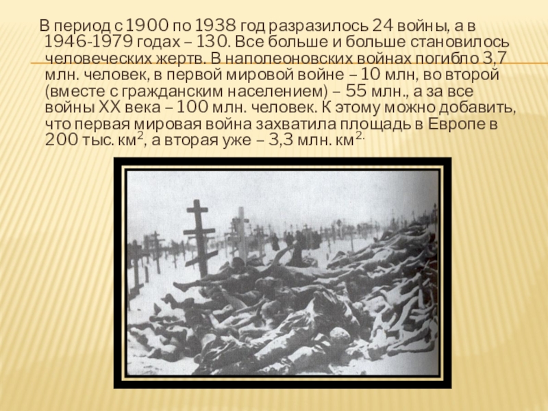 и больше становилось человеческих жертв. В наполеоновских войнах погибло 3,7 млн. человек, в первой мировой войне – 10 млн, во второй (вместе с гражданским населением) – 55 млн., а за все войны XX века – 100 млн. человек. К этому можно добавить, что первая мировая война захватила площадь в Европе в 200 тыс. км2, а вторая уже – 3,3 млн. км2.
