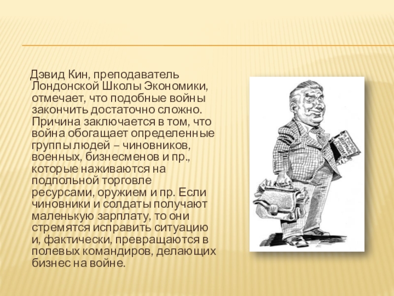 что война обогащает определенные группы людей – чиновников, военных, бизнесменов и пр., которые наживаются на подпольной торговле ресурсами, оружием и пр. Если чиновники и солдаты получают маленькую зарплату, то они стремятся исправить ситуацию и, фактически, превращаются в полевых командиров, делающих бизнес на войне.