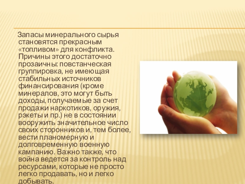 источников финансирования (кроме минералов, это могут быть доходы, получаемые за счет продажи наркотиков, оружия, рэкеты и пр.) не в состоянии вооружить значительное число своих сторонников и, тем более, вести планомерную и долговременную военную кампанию. Важно также, что война ведется за контроль над ресурсами, которые не просто легко продавать, но и легко добывать.